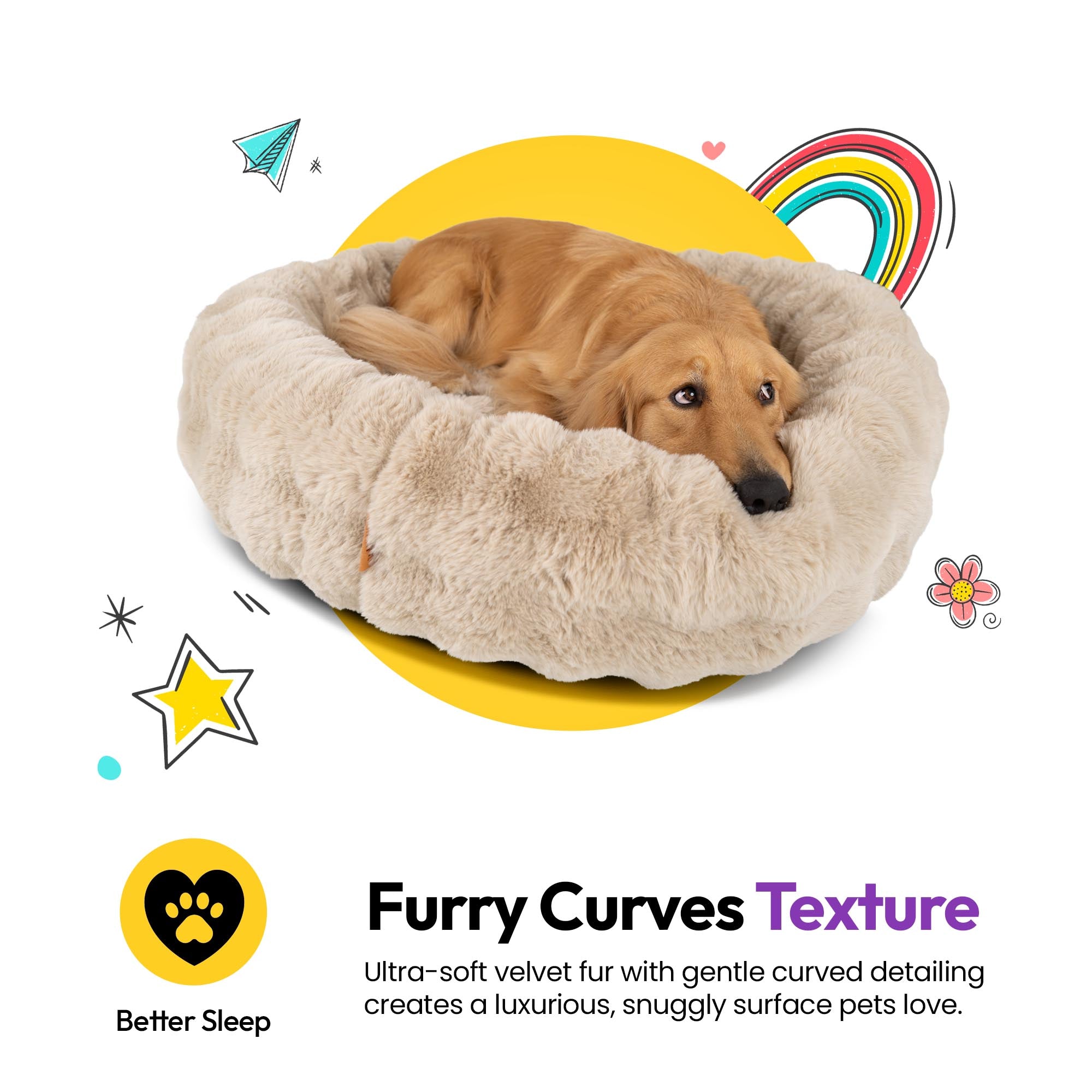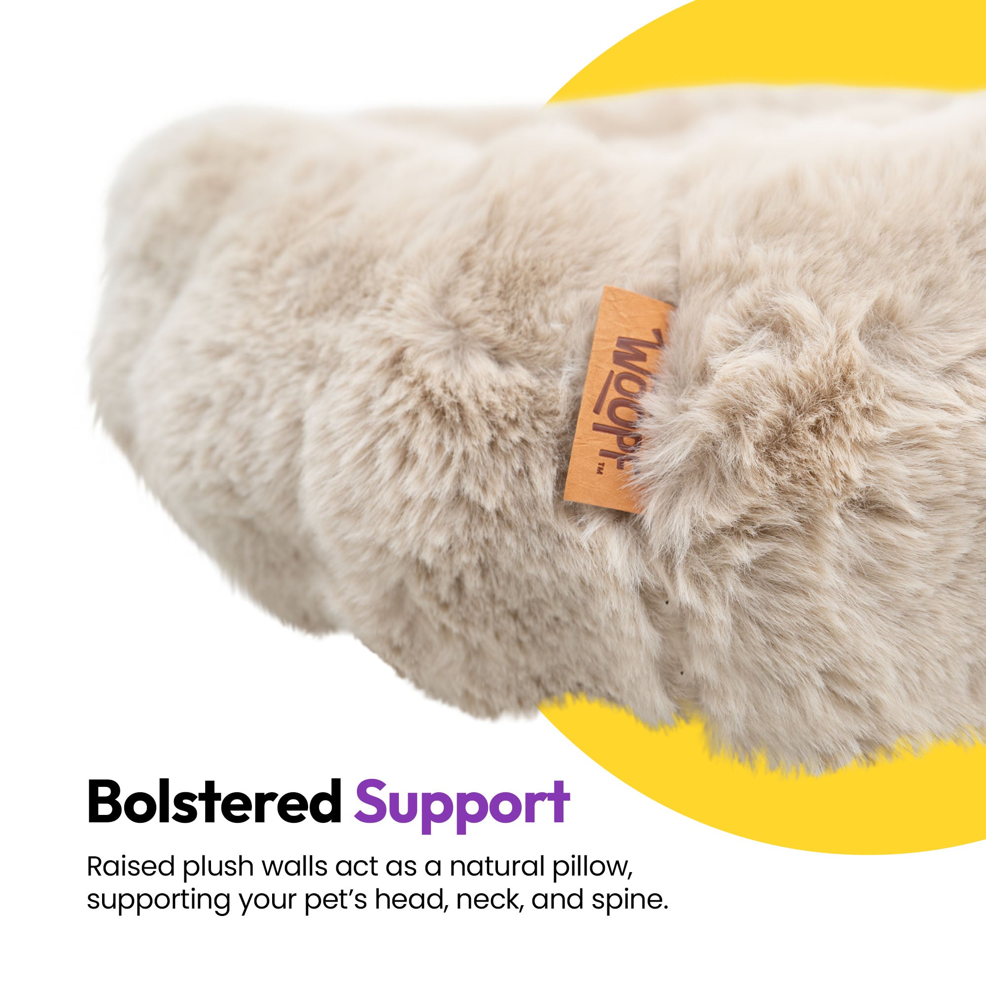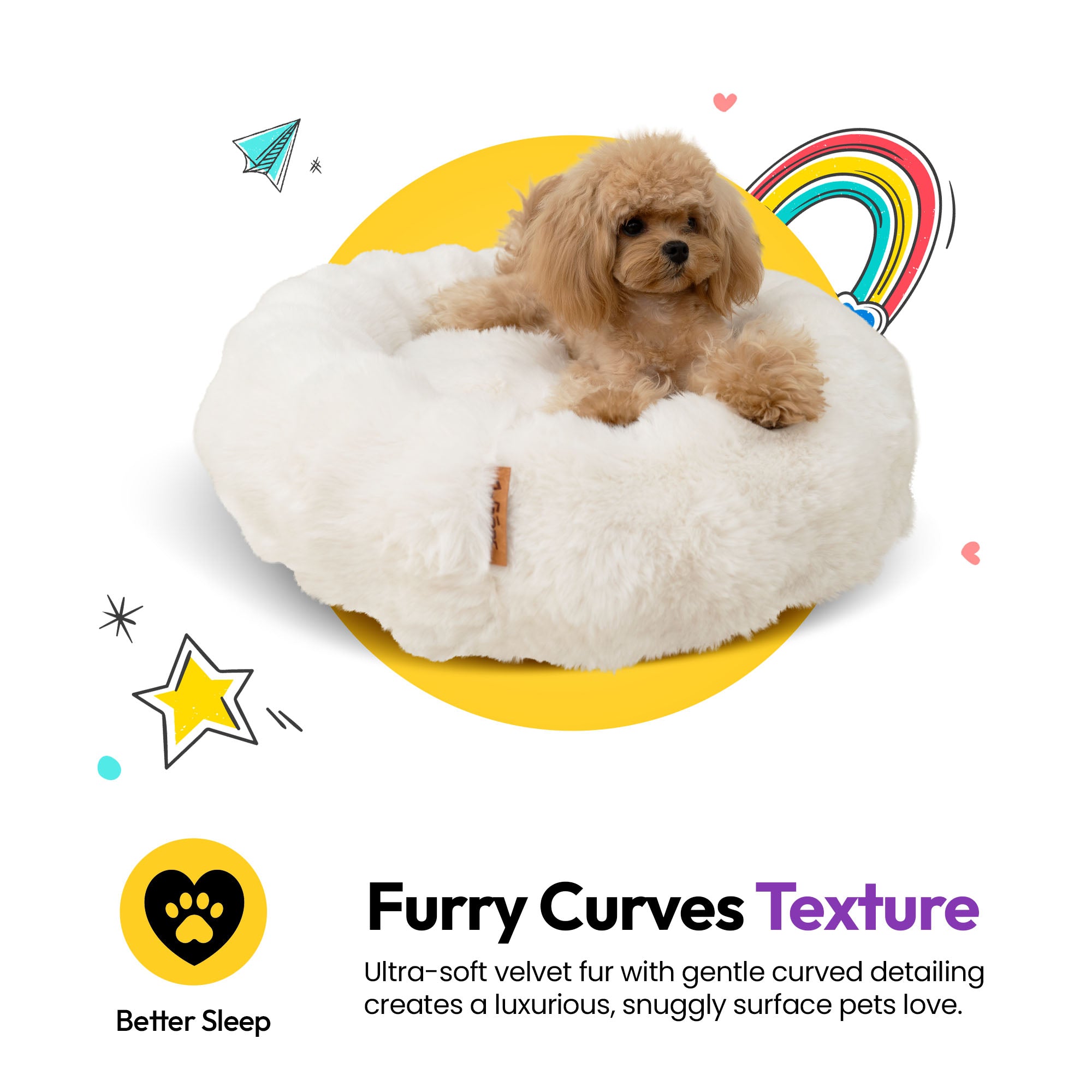 Weiche, erhöhte Randwände bieten Kopf- & Nackenstütze, während die geschwungene, pelzige Oberfläche eine sichere, beruhigende Umgebung schafft.