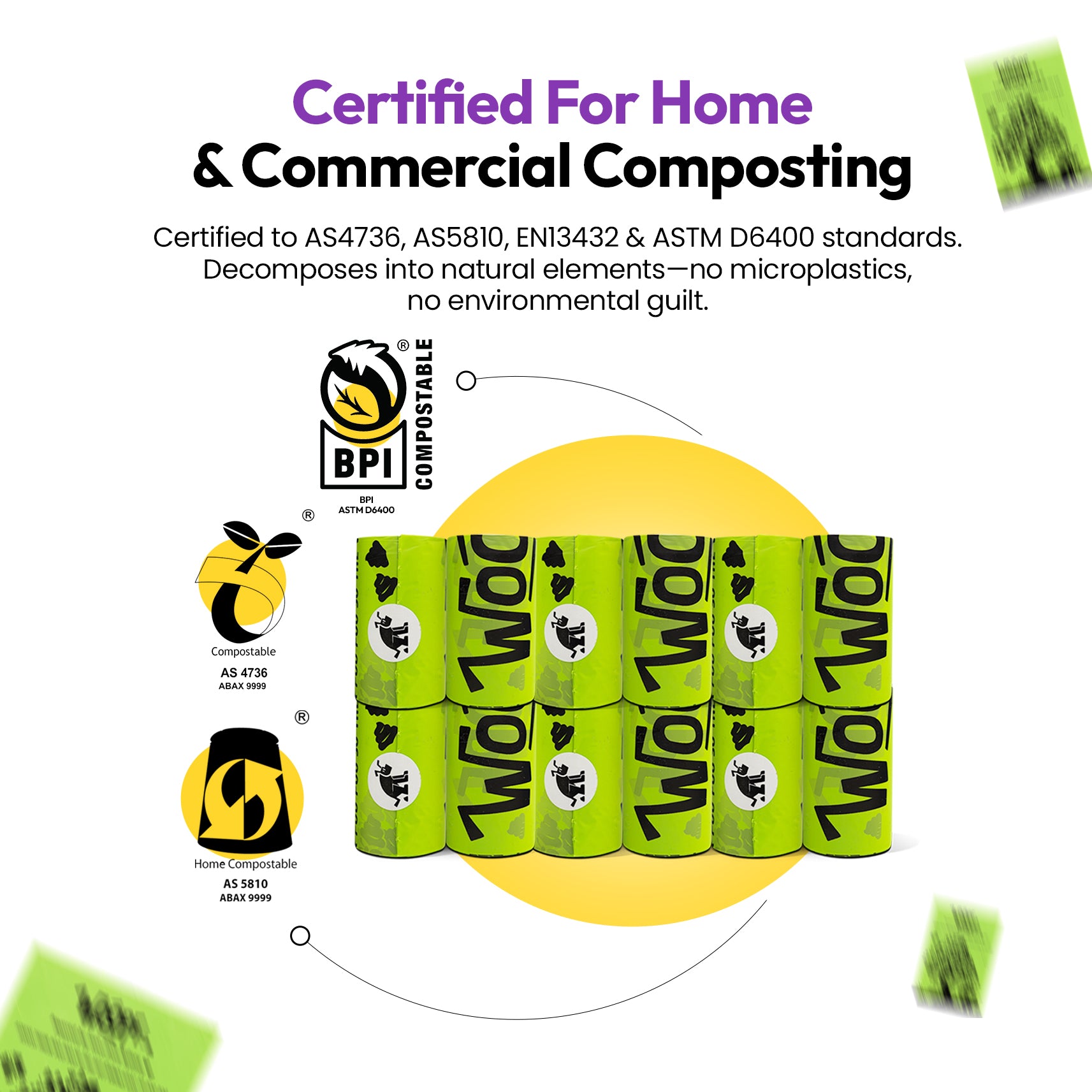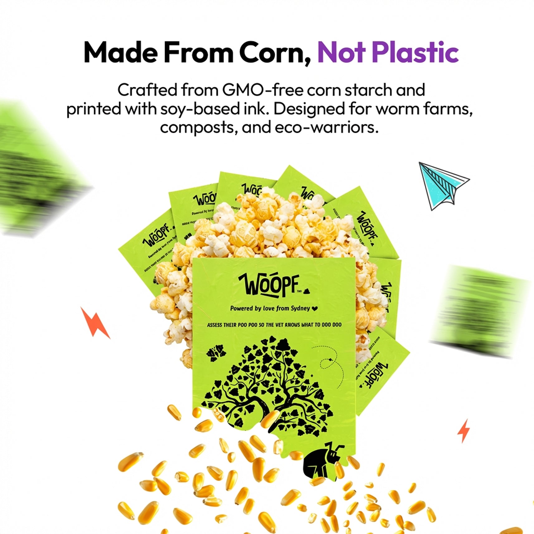 Unlike “oxo-degradable” or partially plastic bags, WOOPF™ Poop & Go bags are made from GMO-free corn starch and certified compostable to: