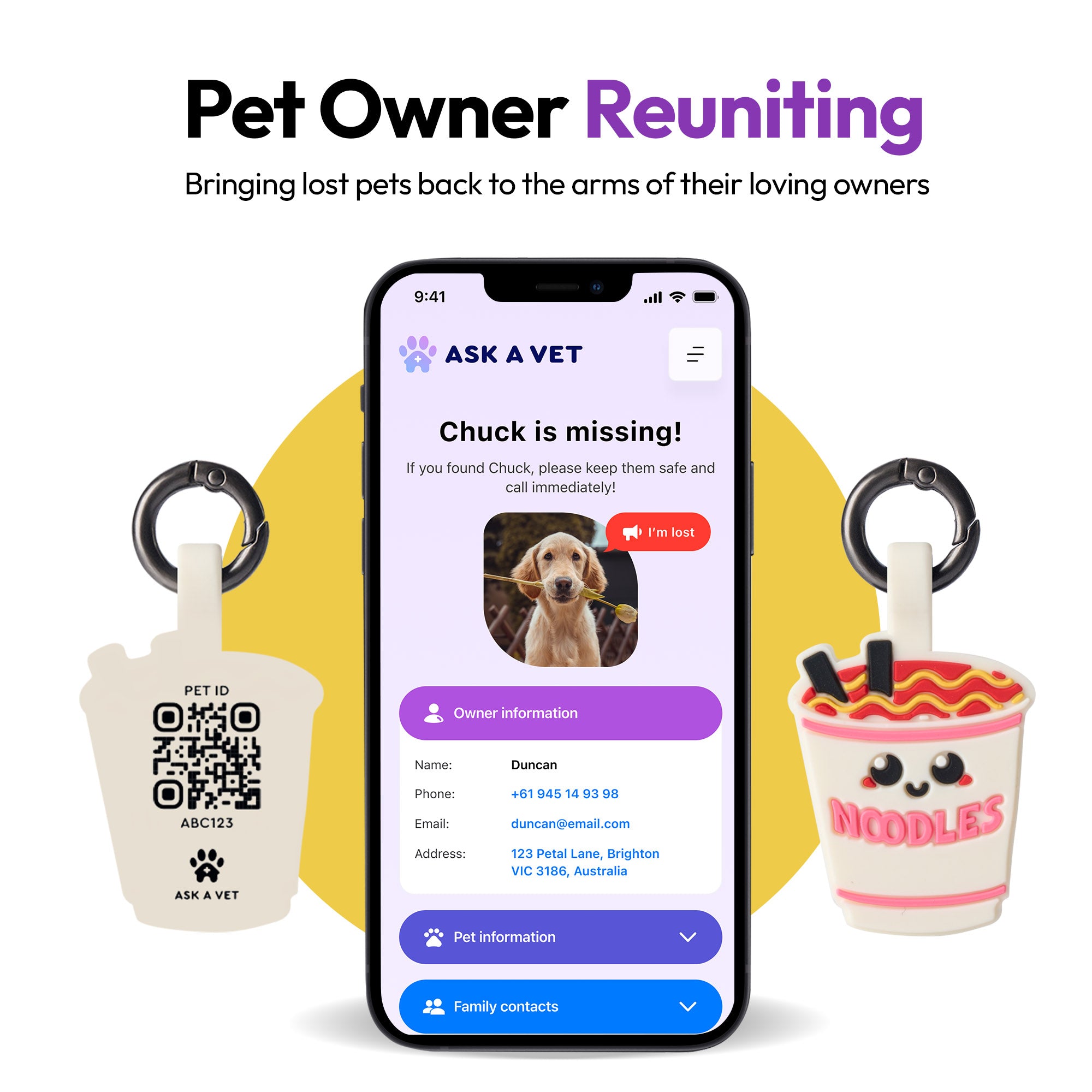 Give your pet a tasty twist of safety with the ASK A VET Noodles Smart NFC & QR Code Pet ID Tag – a playful ramen-inspired design that combines kawaii style with smart protection.