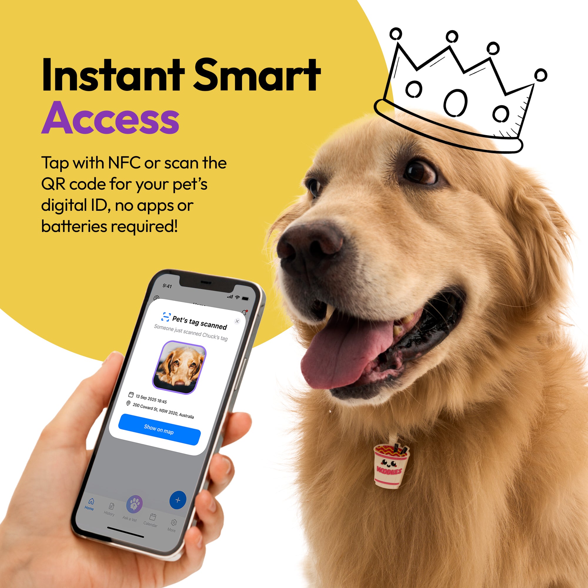 📱 INSTANT SMART ID – NFC chip + QR code for fast pet profile access.