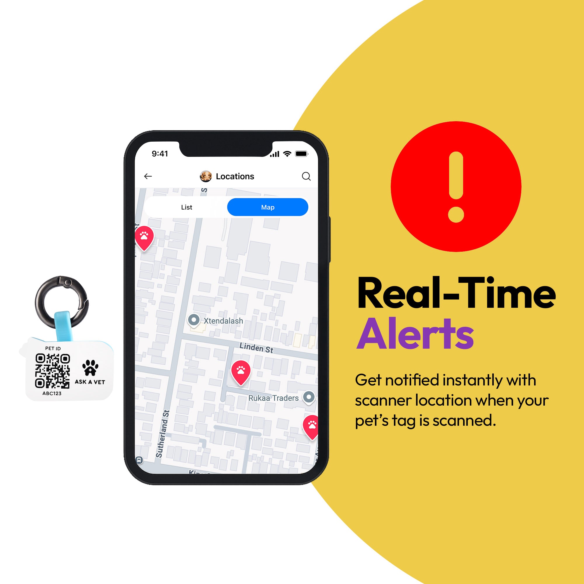 🚨 LOCATION ALERTS – Get instant scan notifications with your pet’s location.