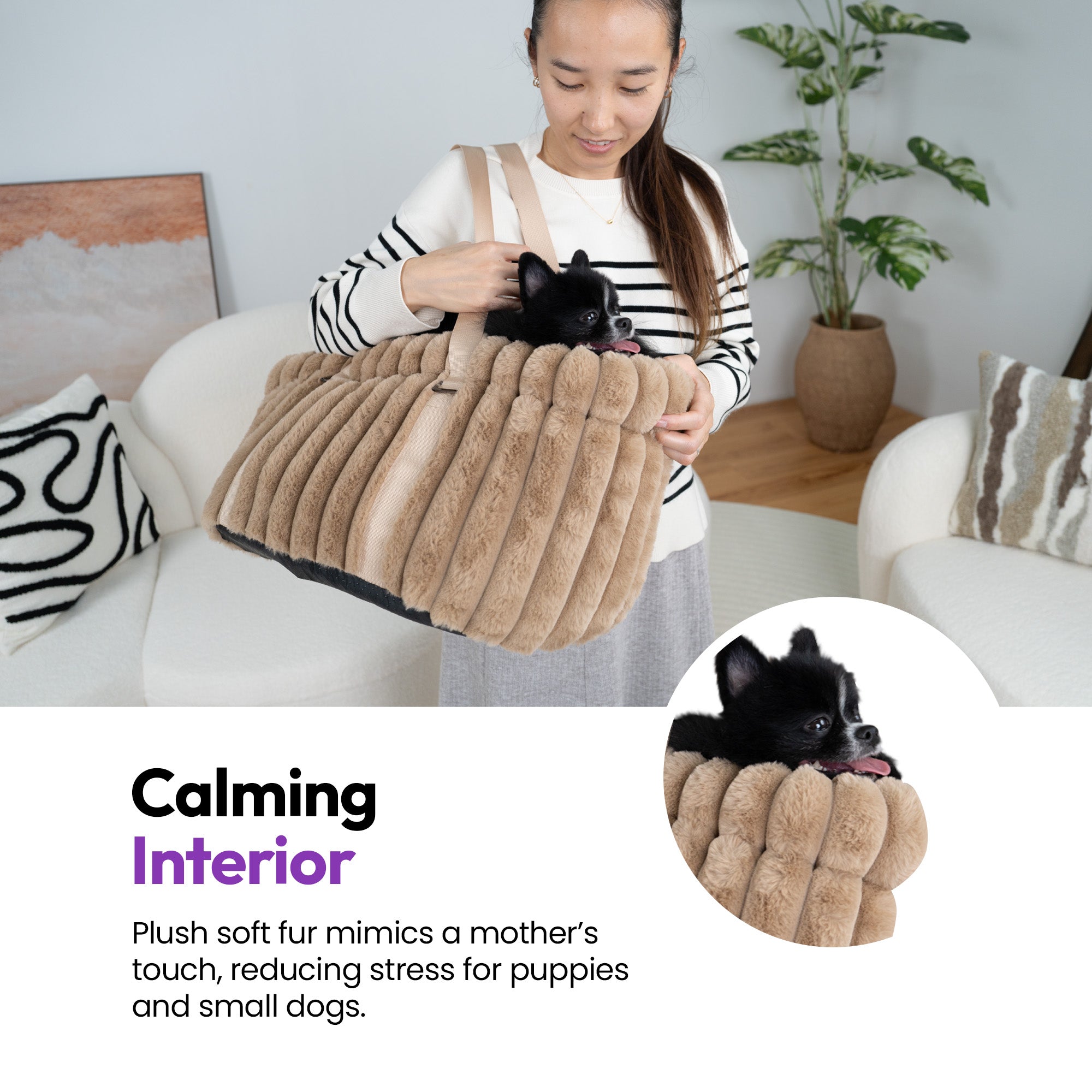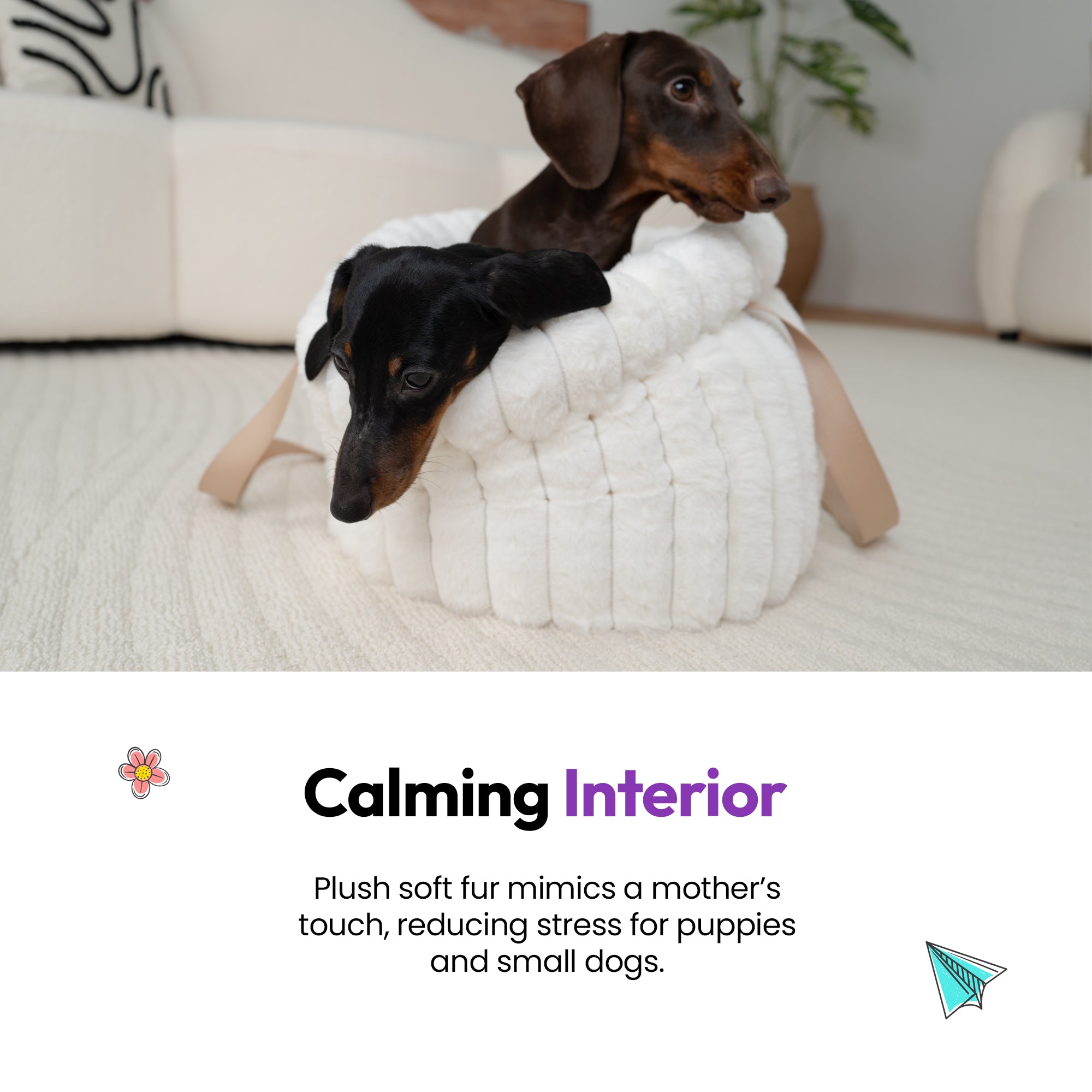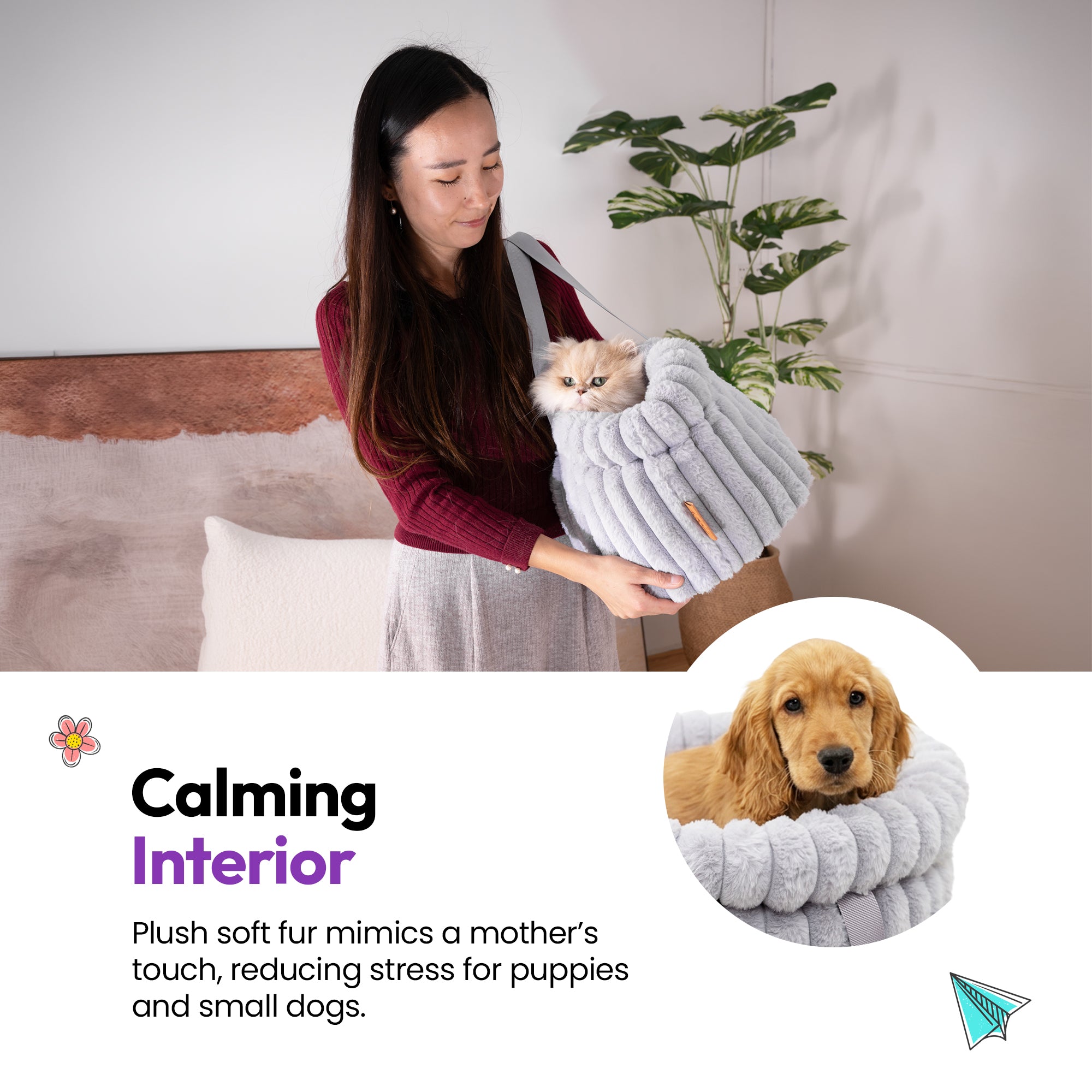 With a plush velvet-feel faux-fur interior, structured walls, reinforced handles, and a secure safety clip, this calming puppy travel bag keeps your pet safe, supported, and relaxed wherever you go.