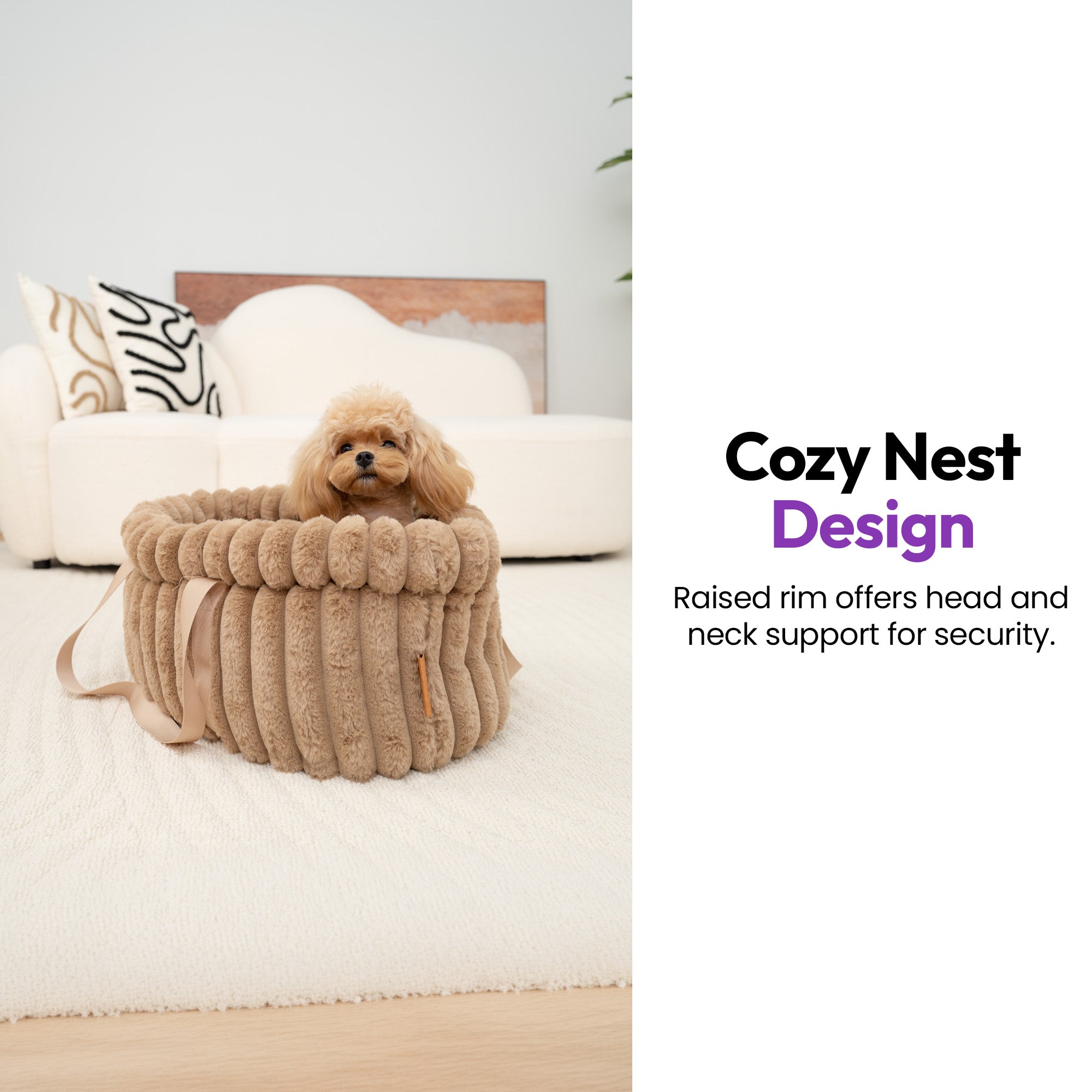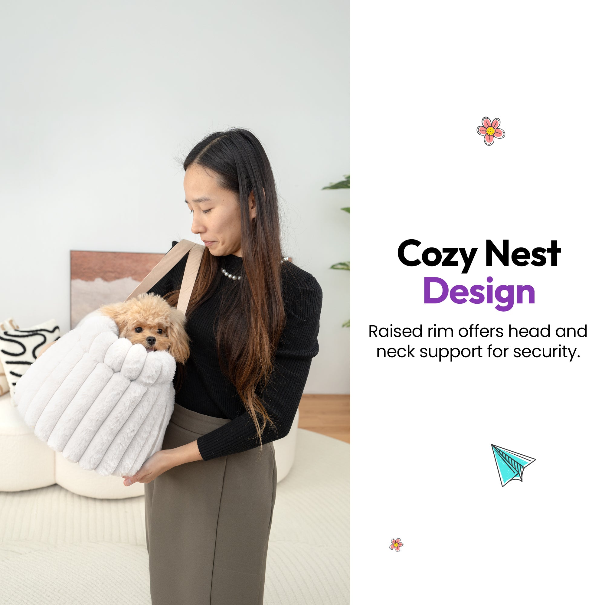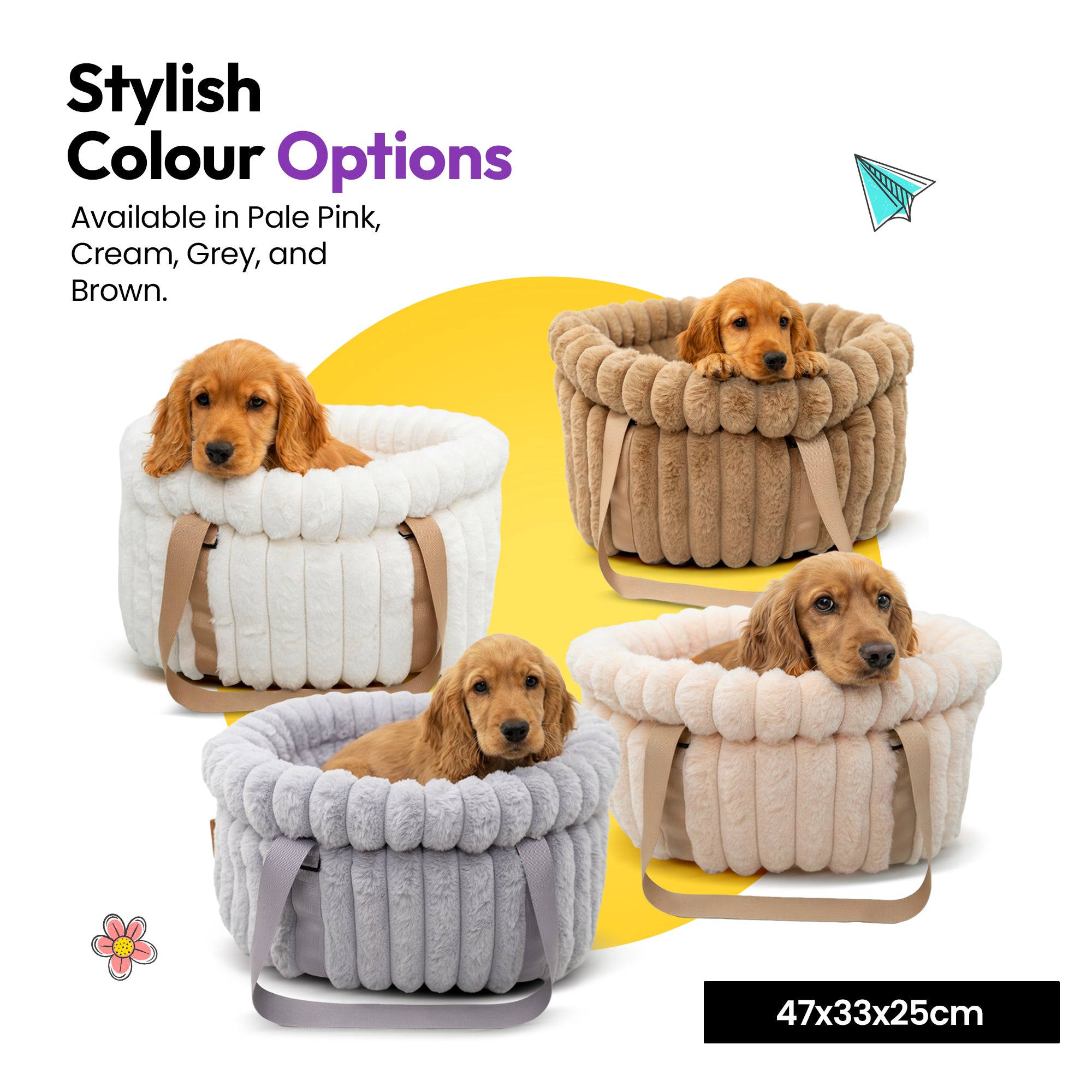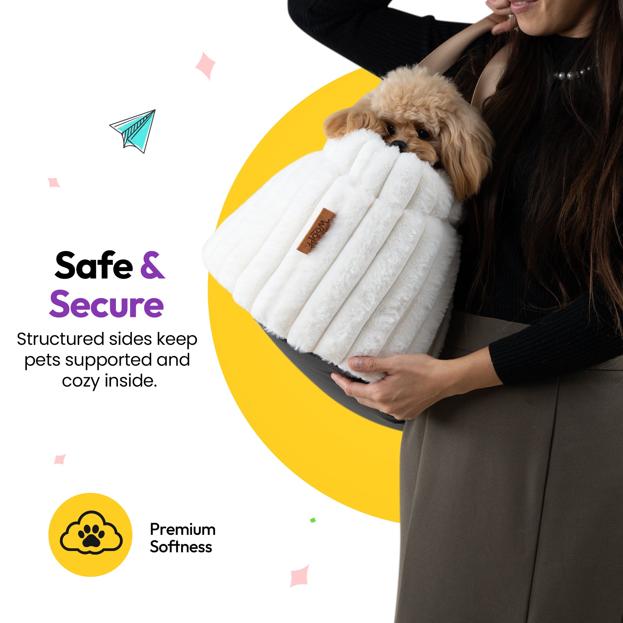 With a plush velvet-feel faux-fur interior, structured walls, reinforced handles, and a secure safety clip, this calming puppy travel bag keeps your pet safe, supported, and relaxed wherever you go.