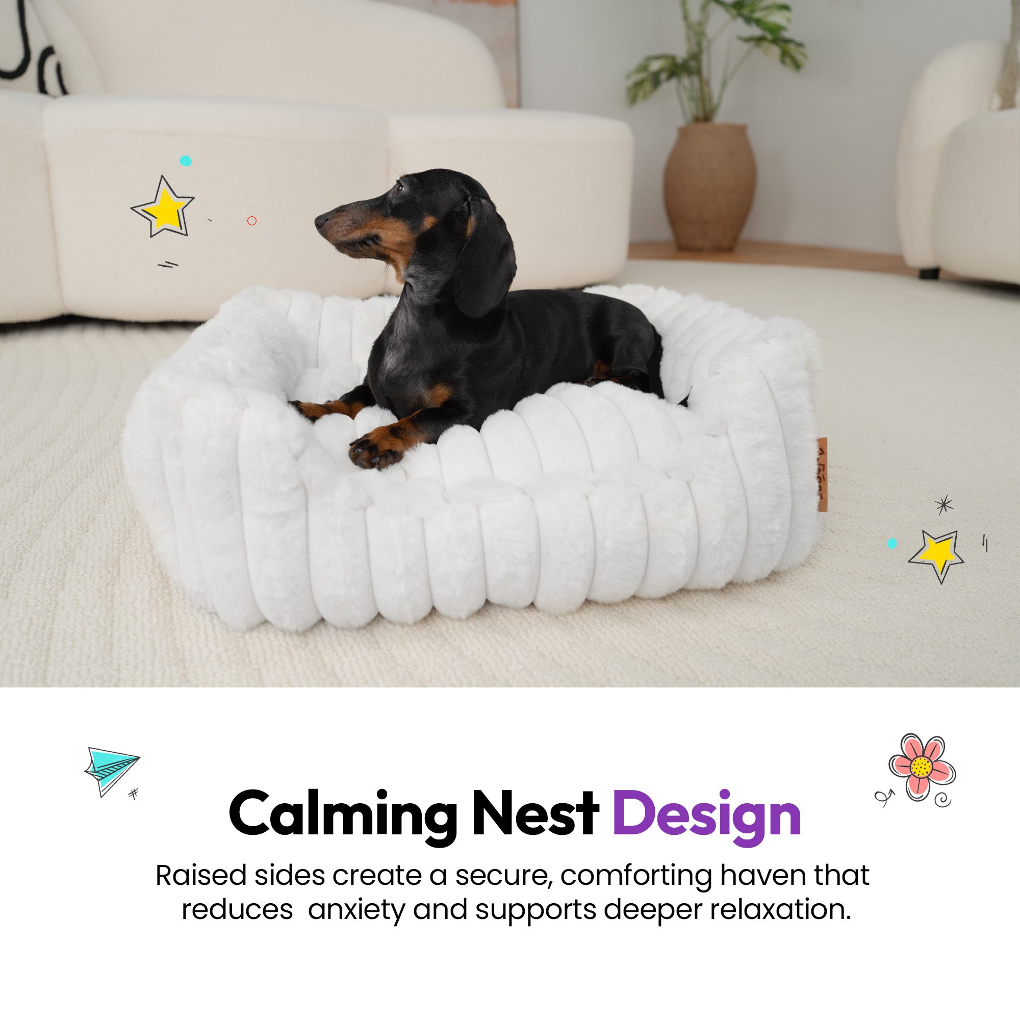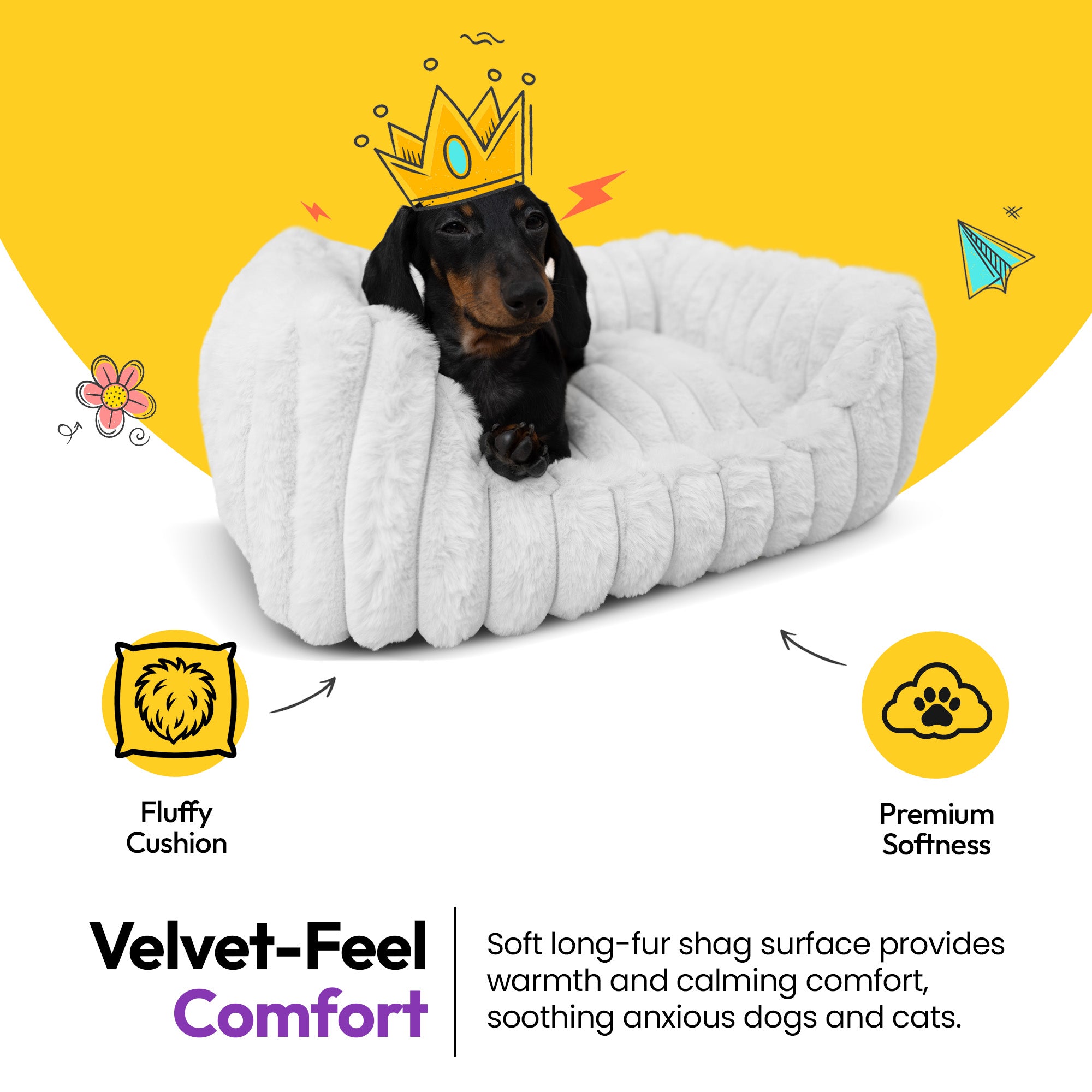 Featuring a plush velvet-feel faux-fur corduroy top, structured cushioning, raised bolster walls, and a rubber dot anti-slip base, this rectangular calming dog bed combines comfort, stability, and modern style.