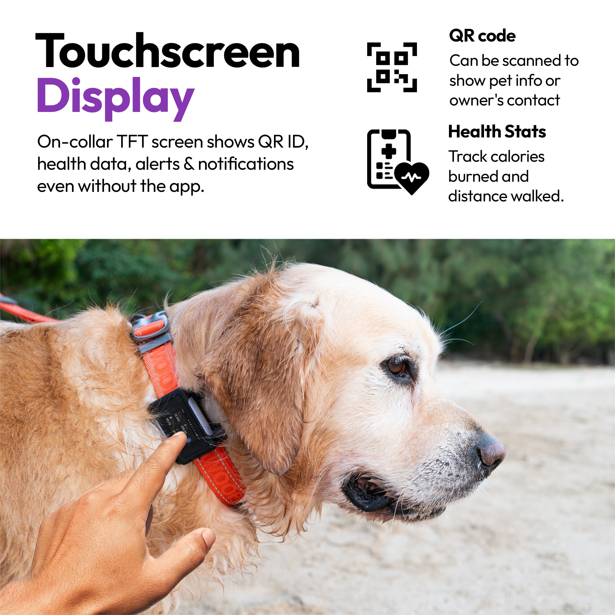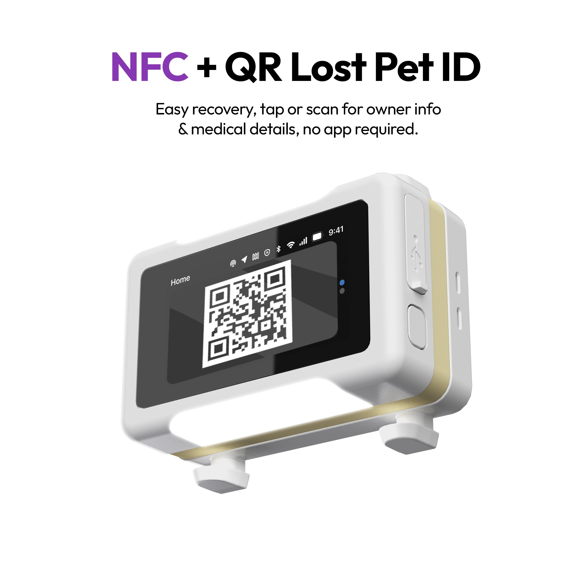• 🖥️ 触摸屏显示 + 丢失宠物 ID: TFT 屏幕显示实时健康数据、二维码 ID 代码和警报。双 NFC + QR 恢复确保任何人都可以安全地归还您的宠物——无需应用程序。