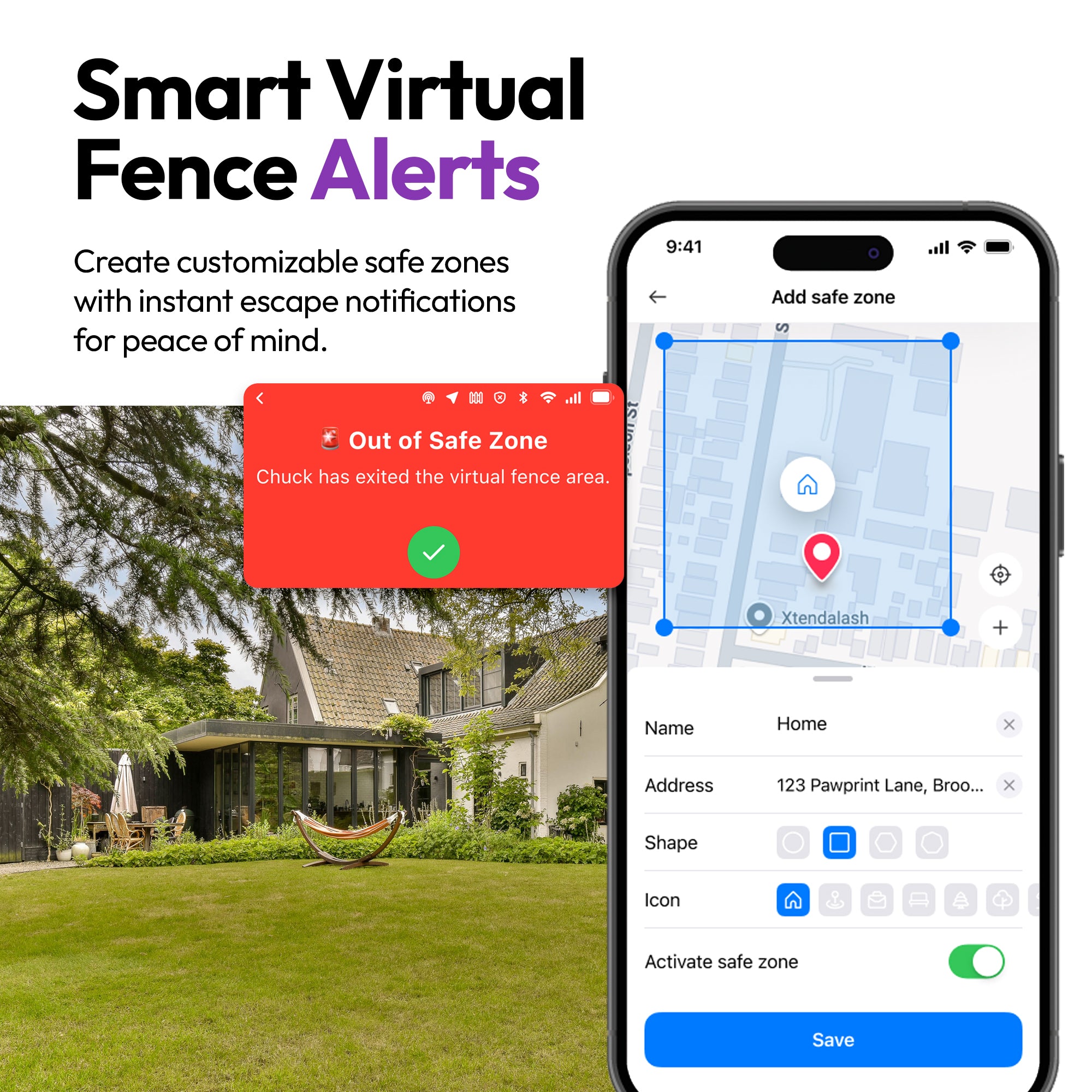 • 📍 实时 GPS + 虚拟围栏: 使用 4G/LTE + UWB 精确追踪您的宠物。设置可自定义的安全区域,并提供即时逃逸警报以确保最大安全性。
