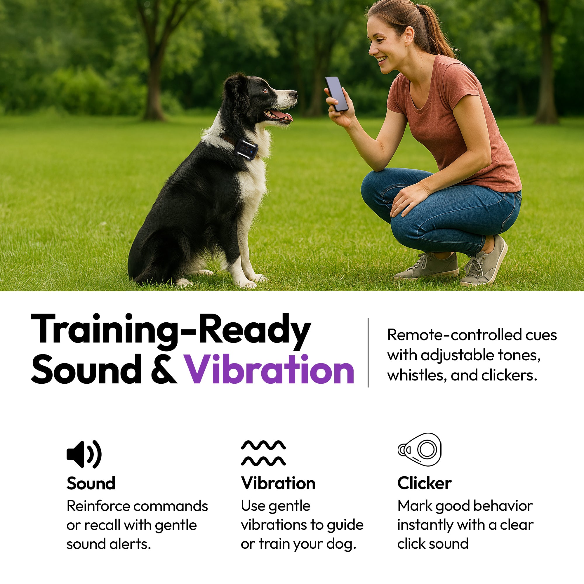 • 🔊 行为检测 + 训练工具: AI 吠叫检测、焦虑警报和内置声音/振动提示用于训练。通过 Ask A Vet 应用程序远程强化指令。